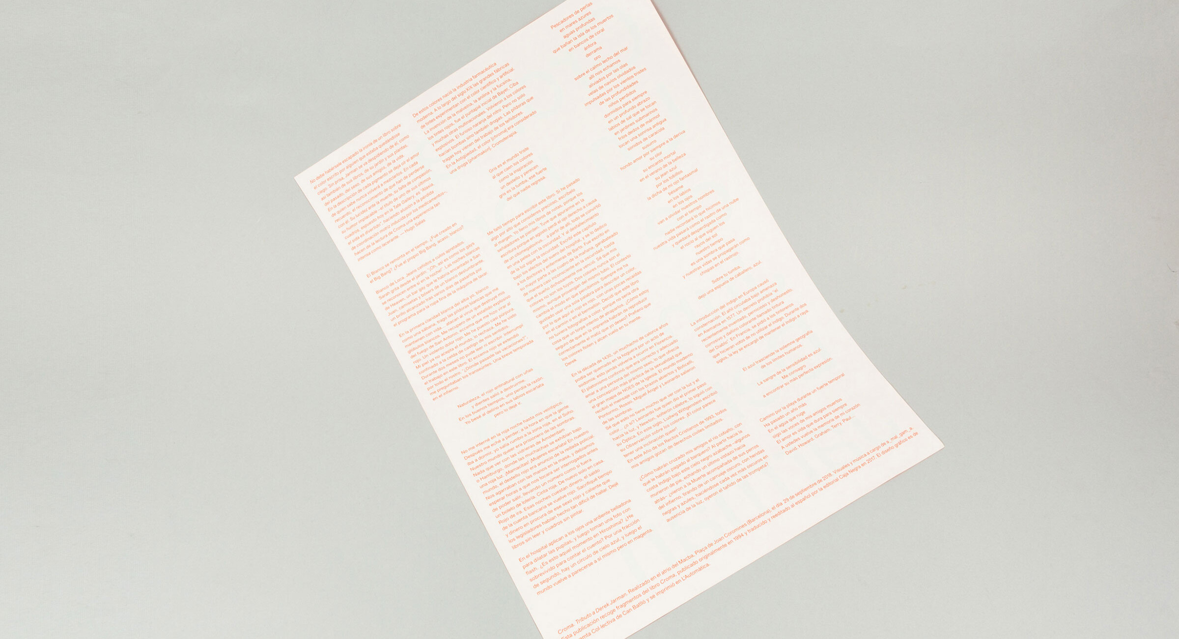 Croma. Tribut a Derek Jarman. Realitzat a l’atri del Macba, Plaça de Joan Coromines (Barcelona), el dia 29 de setembre de 2018. Visuals i música a càrrec d’a_mal_gam_a. Aquesta publicació recull fragments del llibre Croma, publicat originalment el 1994 i traduït i reeditat a l’espanyol per l’editorial Caja Negra el 2017. El disseny gràfic és de La Impremta Col·lectiva de Can Batlló i es va imprimir a L’Automàtica.