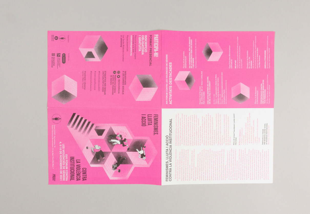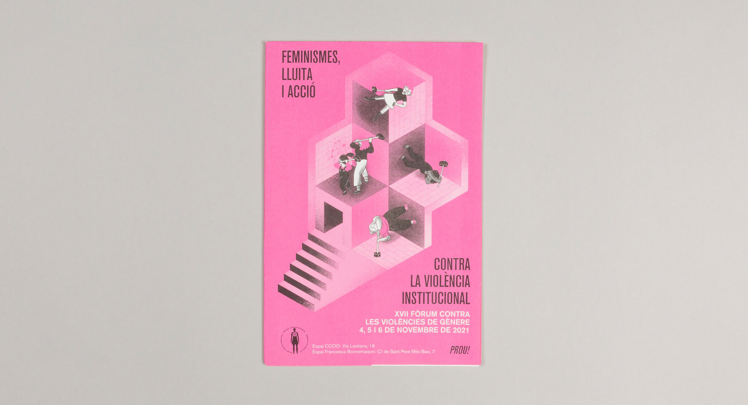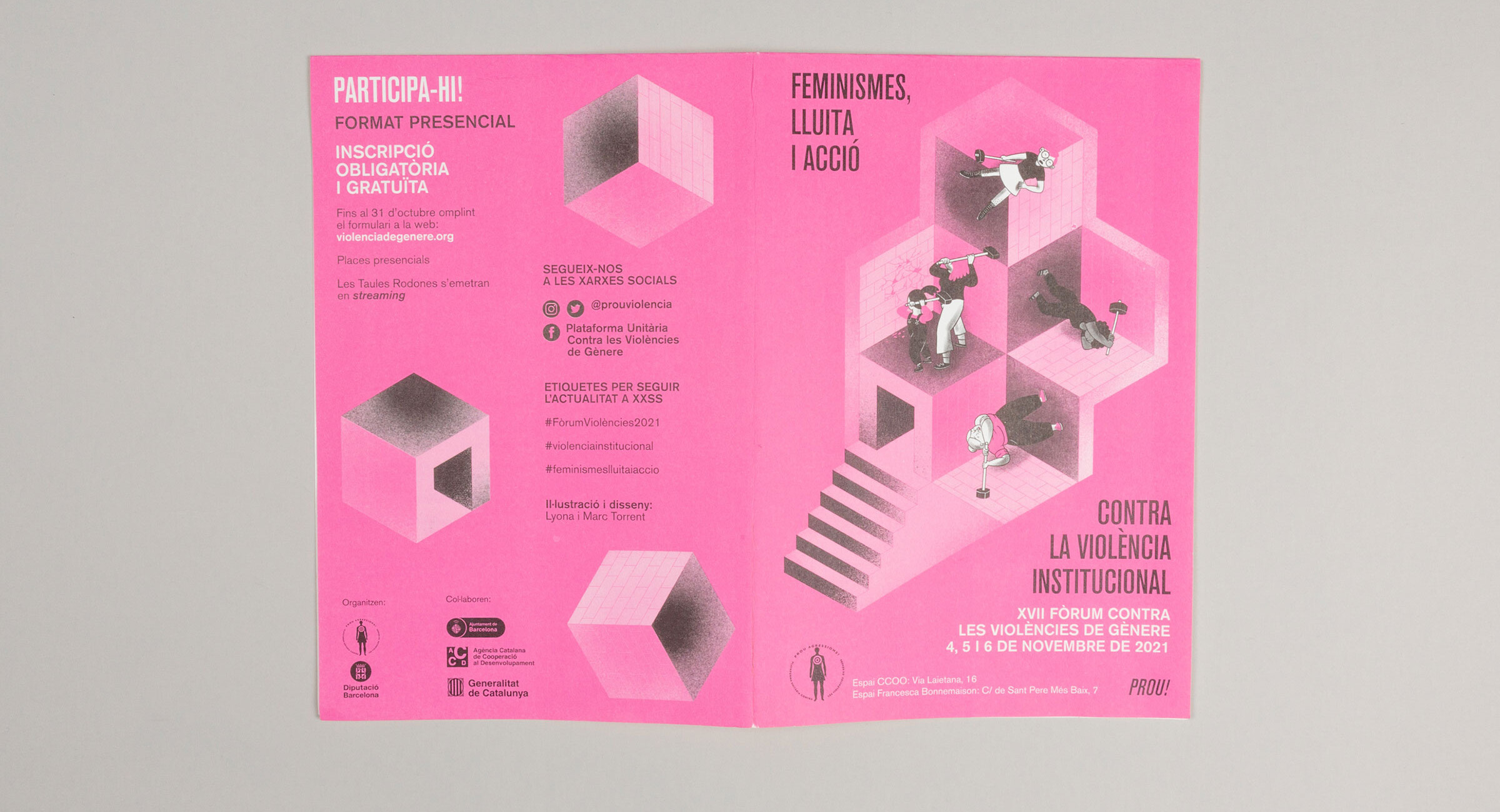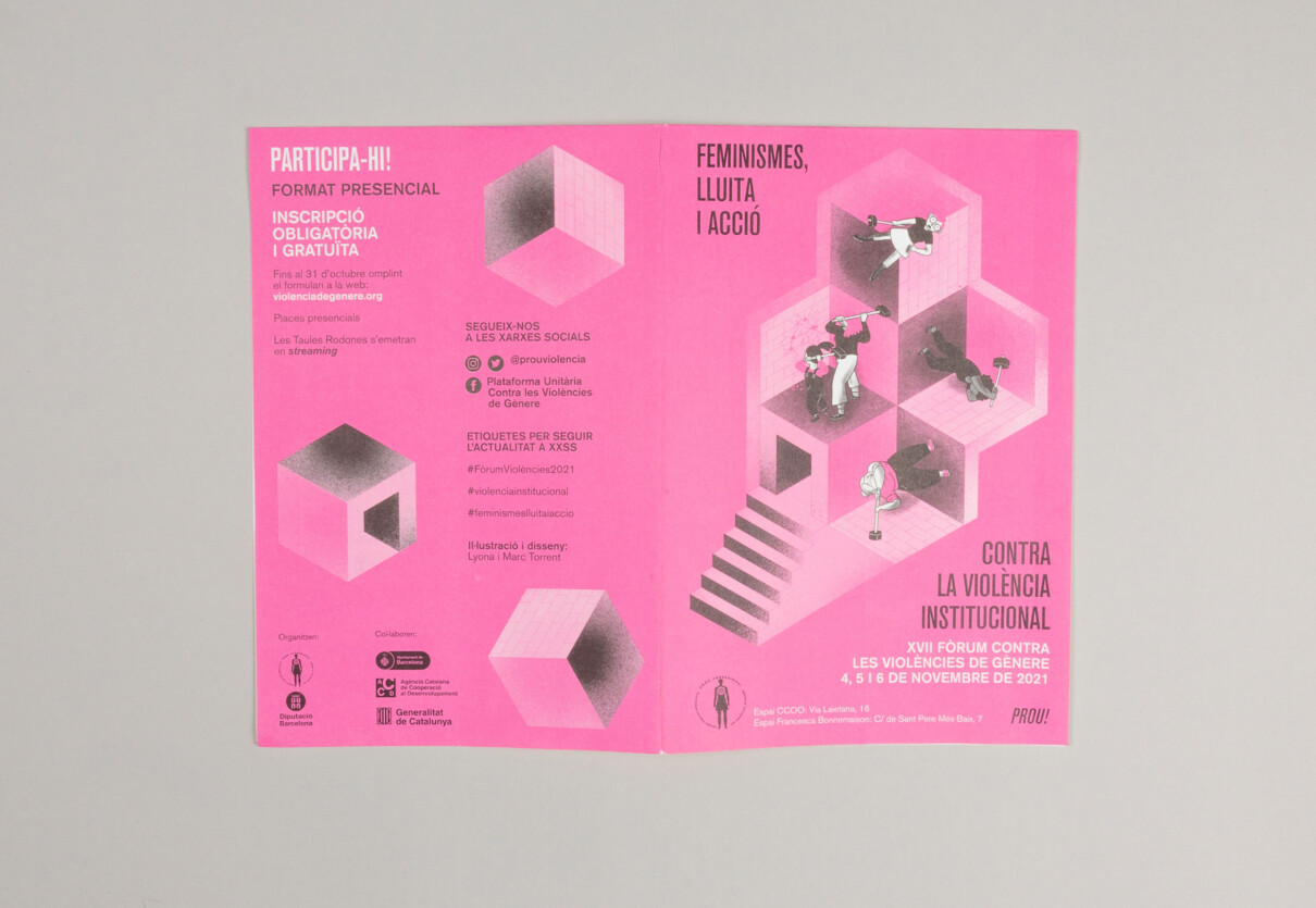 Feminismes, lluita i acció contra la violència institucional Data de producció: 22.10.2021 Tipologia: Cartell / Fulletó Técnica: Òfset Tintes: 2 tintas Acabats: Fendit / Plegat Format: 160 x 240 mm Impressió òfset per al XVII Fórum contra les violències de gènere. Imatges