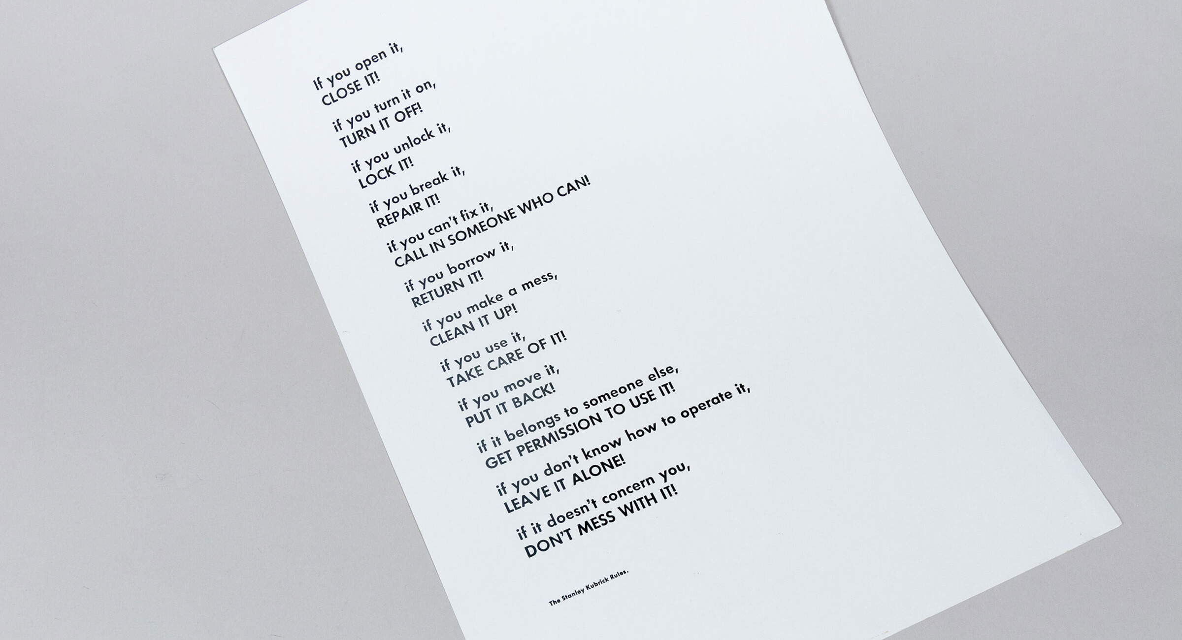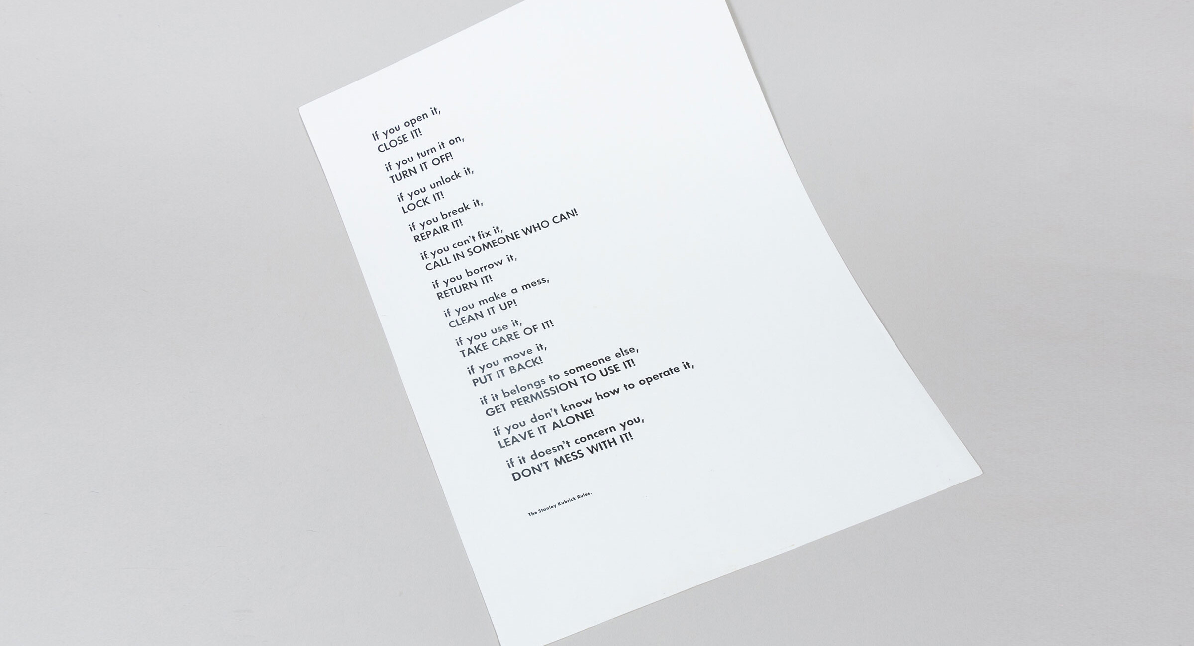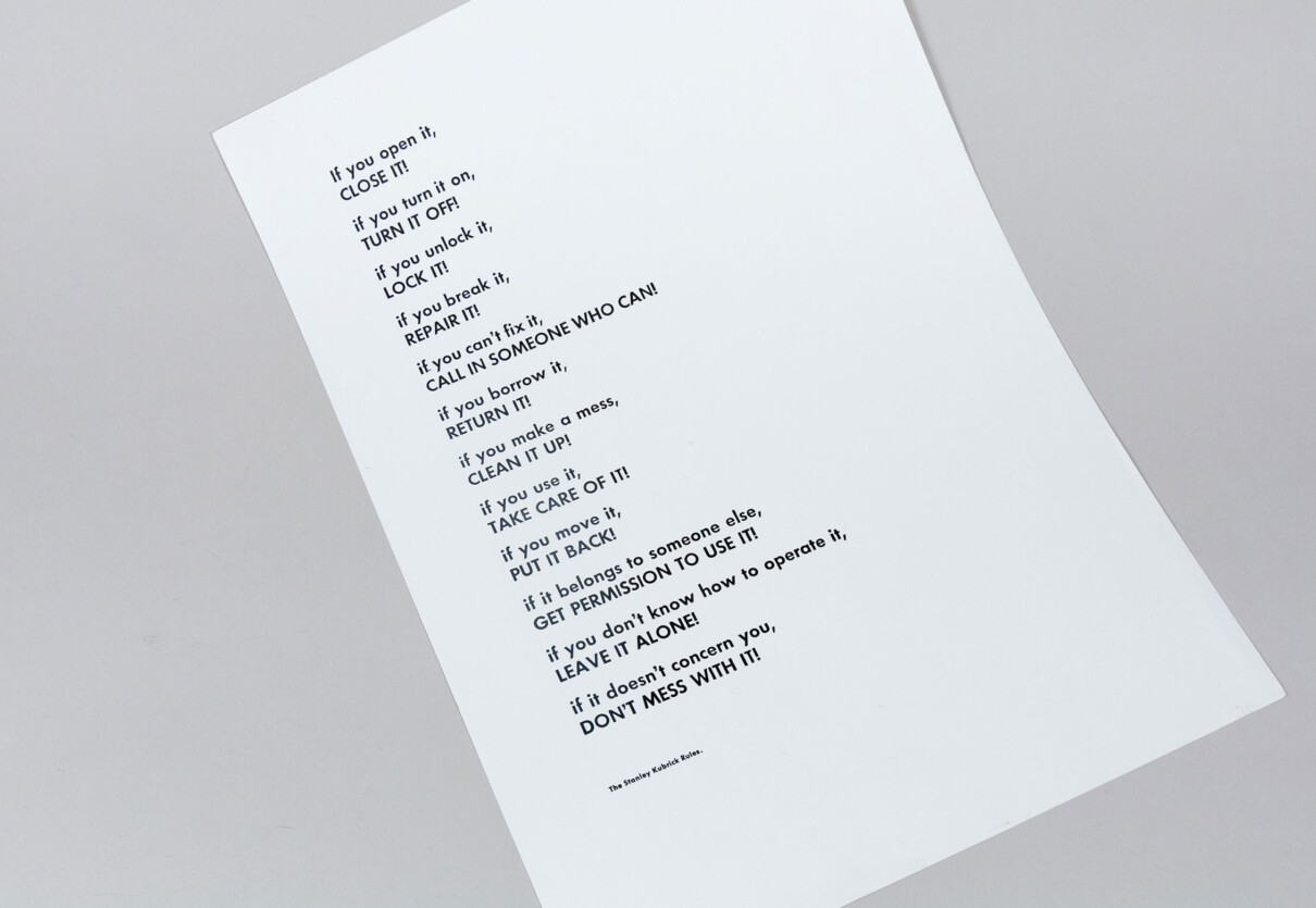 Impressió de les normes que Kubrick penjava en tots els seus rodatges i que presenten un mapa ben pràctic d’entesa i funcionament en qualsevol situació laboral, comunitària o vital.