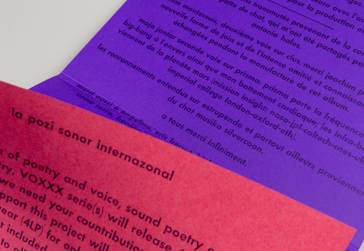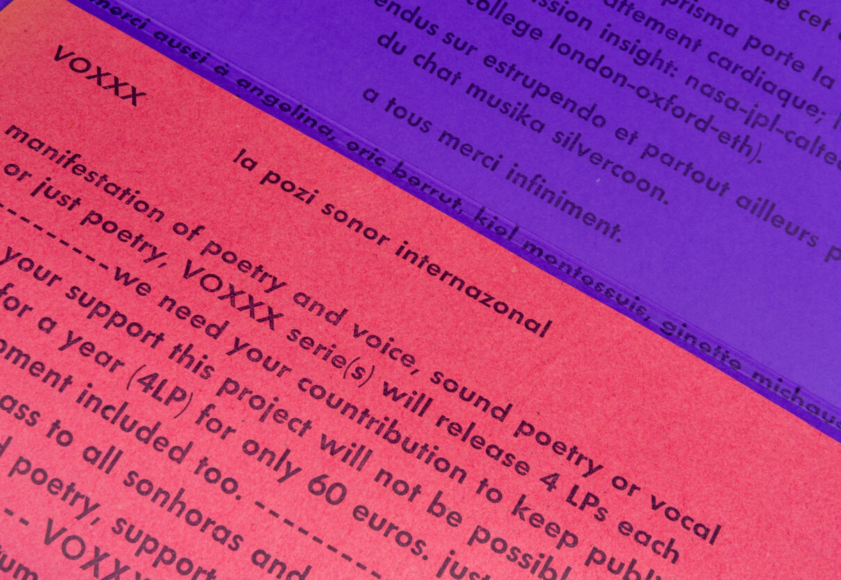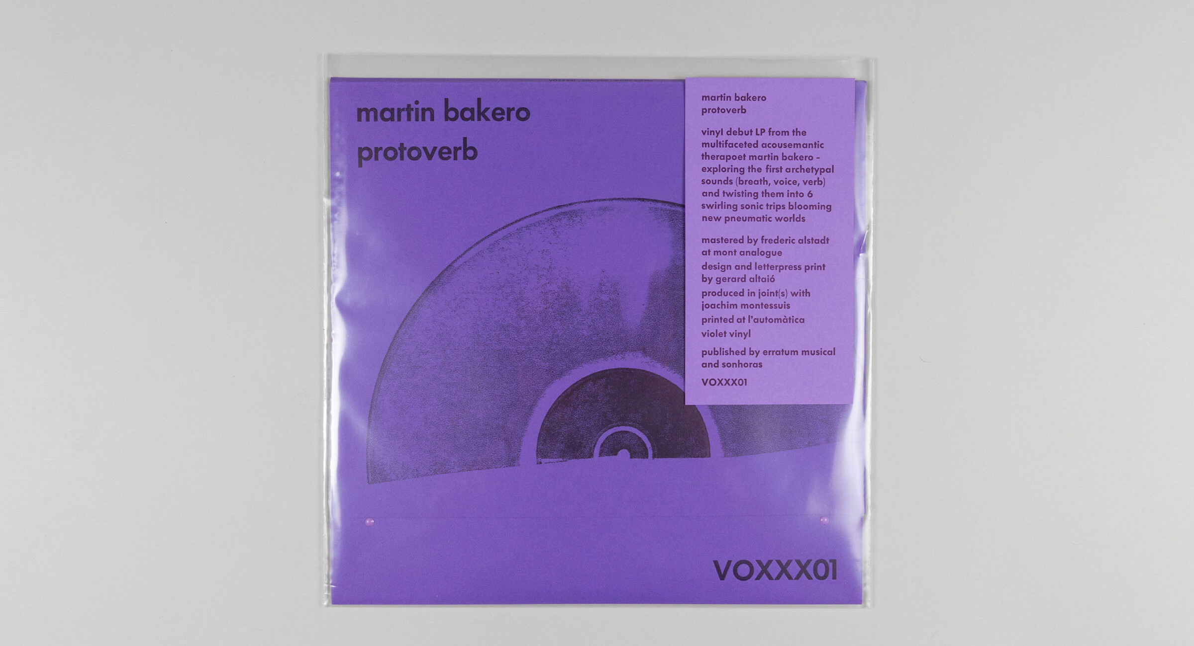 Disc de poesia sonora de la col·lecció VOXXX, publicat per Sonhoras i Erratum Musical. Per al disseny de les portades de la col·lecció s’utilitzen fragments de vinils que s’entinten i s’imprimeixen directament. El disc va acompanyat d’un petit llibret amb els textos dels poemes de Martin Bakero emprats com a bases i partitures de les peces sonores. Del xamanisme a la física quàntica, la paraula s’ha fet servir per fer màgia i transformar i donar forma a la realitat. En aquest LP Bakero explora tota mena d’exorcismes de la veu, alliberant l’alè i altres extravagàncies vocals fent escultures sonores.
