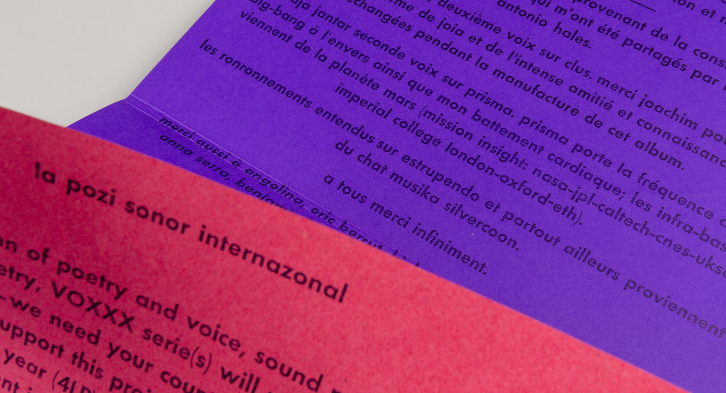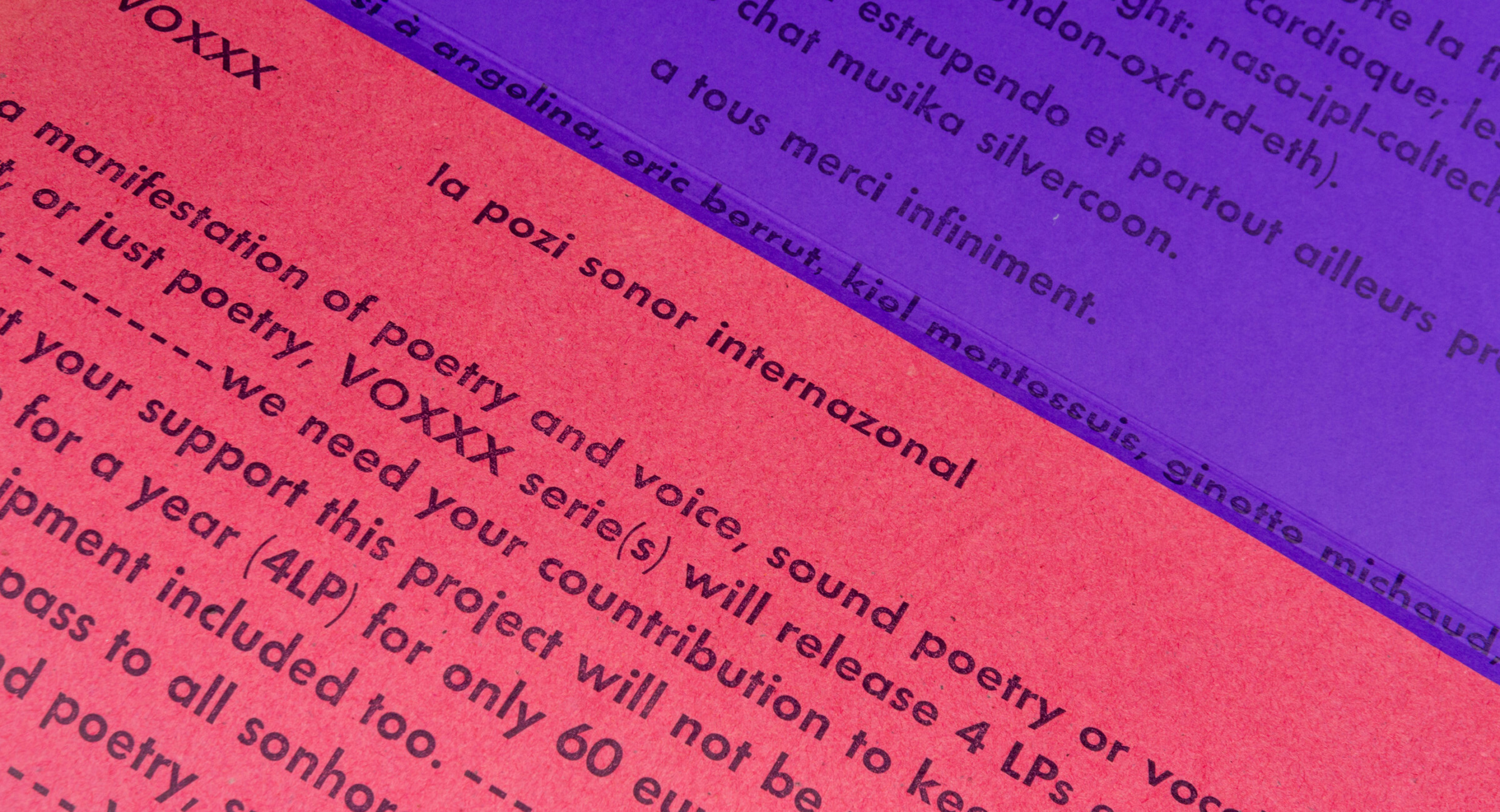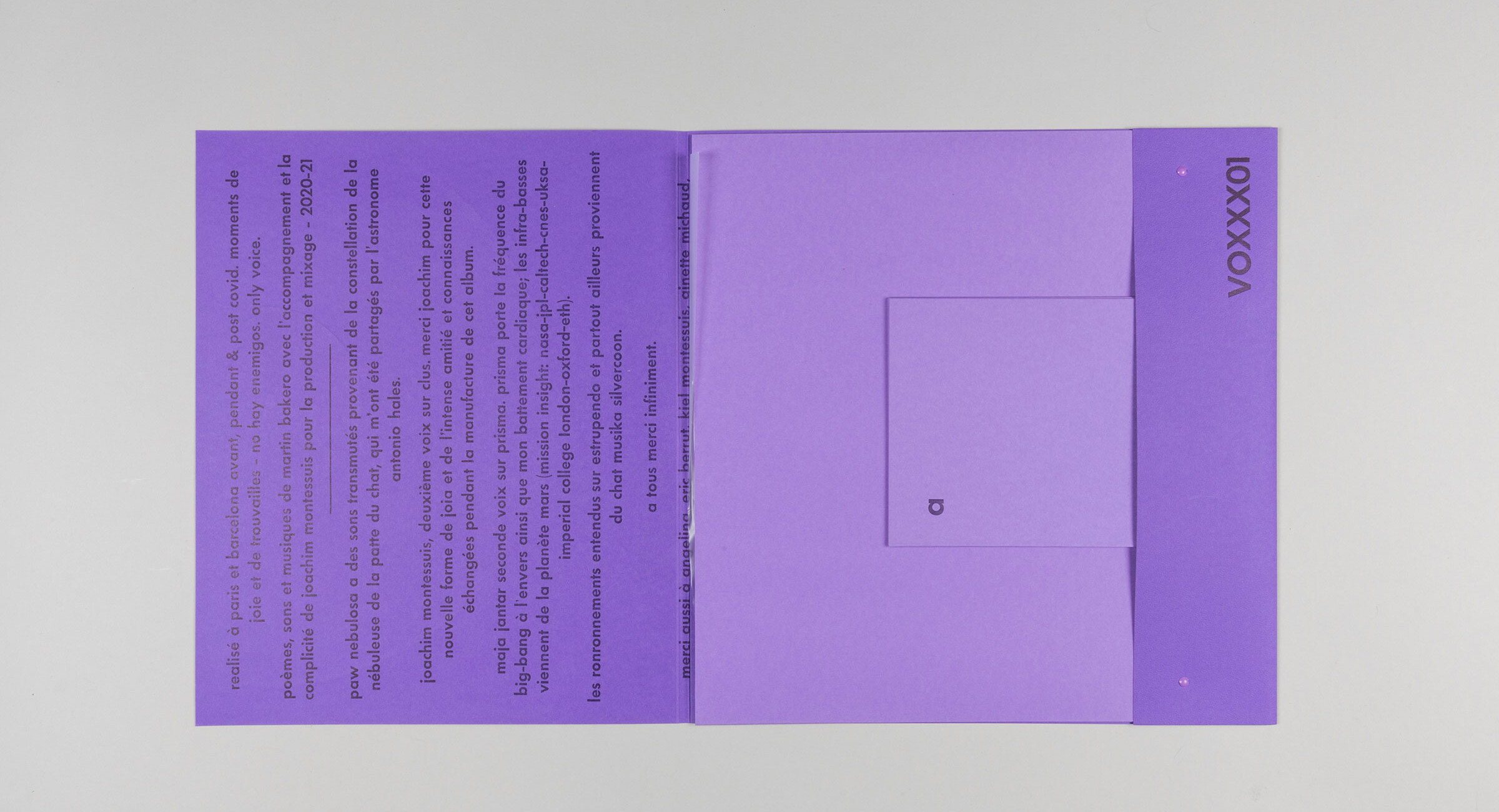 Disc de poesia sonora de la col·lecció VOXXX, publicat per Sonhoras i Erratum Musical. Per al disseny de les portades de la col·lecció s’utilitzen fragments de vinils que s’entinten i s’imprimeixen directament. El disc va acompanyat d’un petit llibret amb els textos dels poemes de Martin Bakero emprats com a bases i partitures de les peces sonores. Del xamanisme a la física quàntica, la paraula s’ha fet servir per fer màgia i transformar i donar forma a la realitat. En aquest LP Bakero explora tota mena d’exorcismes de la veu, alliberant l’alè i altres extravagàncies vocals fent escultures sonores.