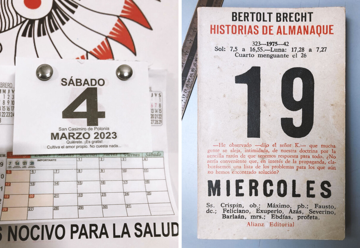En aquest taller es va fer una peça que partia de la portada d’una edició de Bertold Brecht, a manera de calendari antic, i que vam reprendre adaptant el disseny al dia concret en què es feia el taller. La composició clàssica del calendari es va combinar amb l’estil dels cal·ligrames i de la poesia visual, component el número de la data amb punts i comes que omplien la forma.