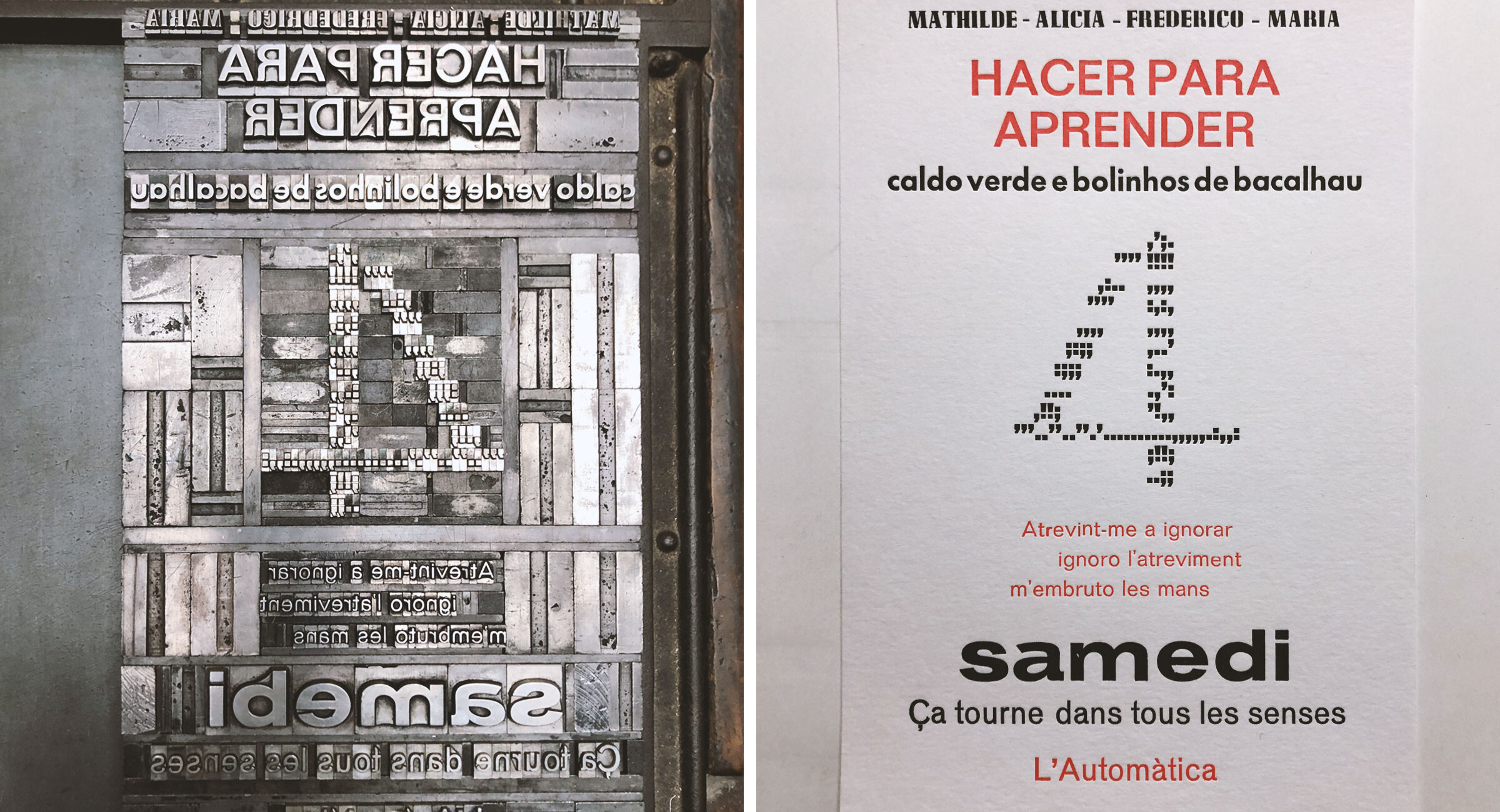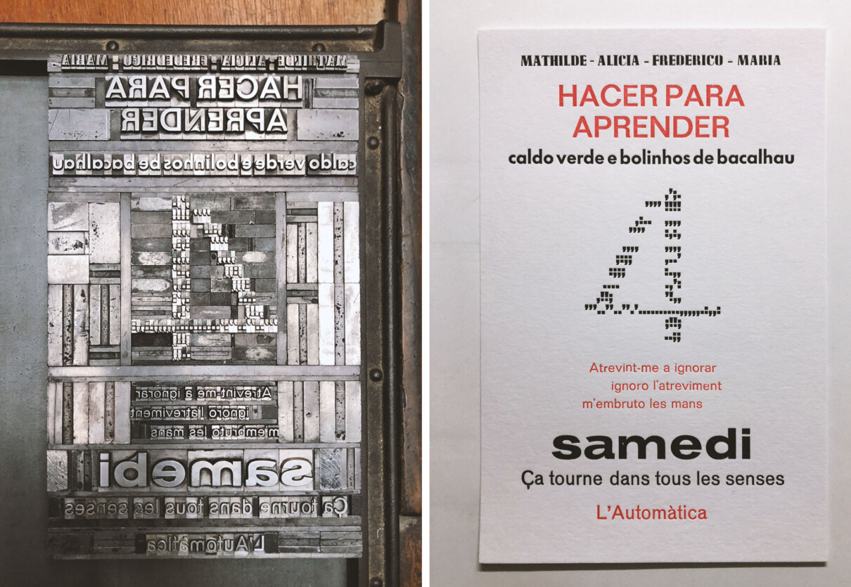 Descobreix com funciona la impressió tipogràfica en una jornada intensiva de 8 hores al nostre taller de L’Automàtica. Pensa, dissenya i produeix entre una i tres peces amb grup reduït de participants. És el taller ideal perquè et puguis familiaritzar amb els processos i les eines d’aquesta tècnica d’impressió i tornar a casa amb algunes còpies de la peça ja impreses. El taller inclou tots els materials necessaris.