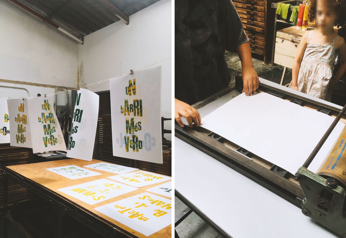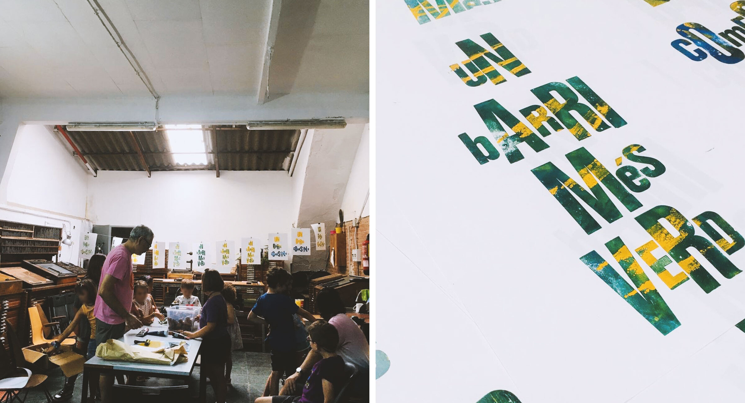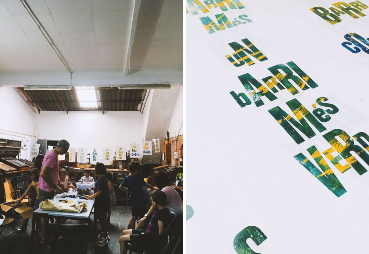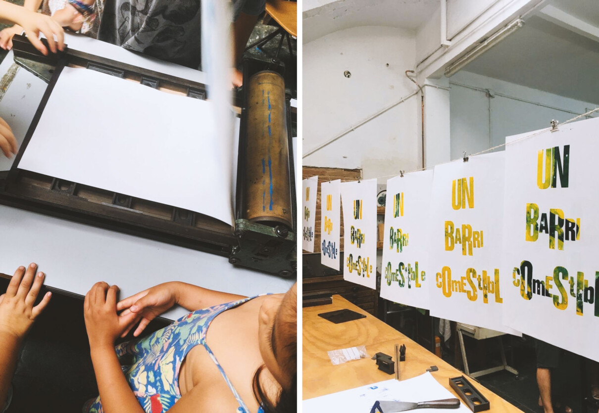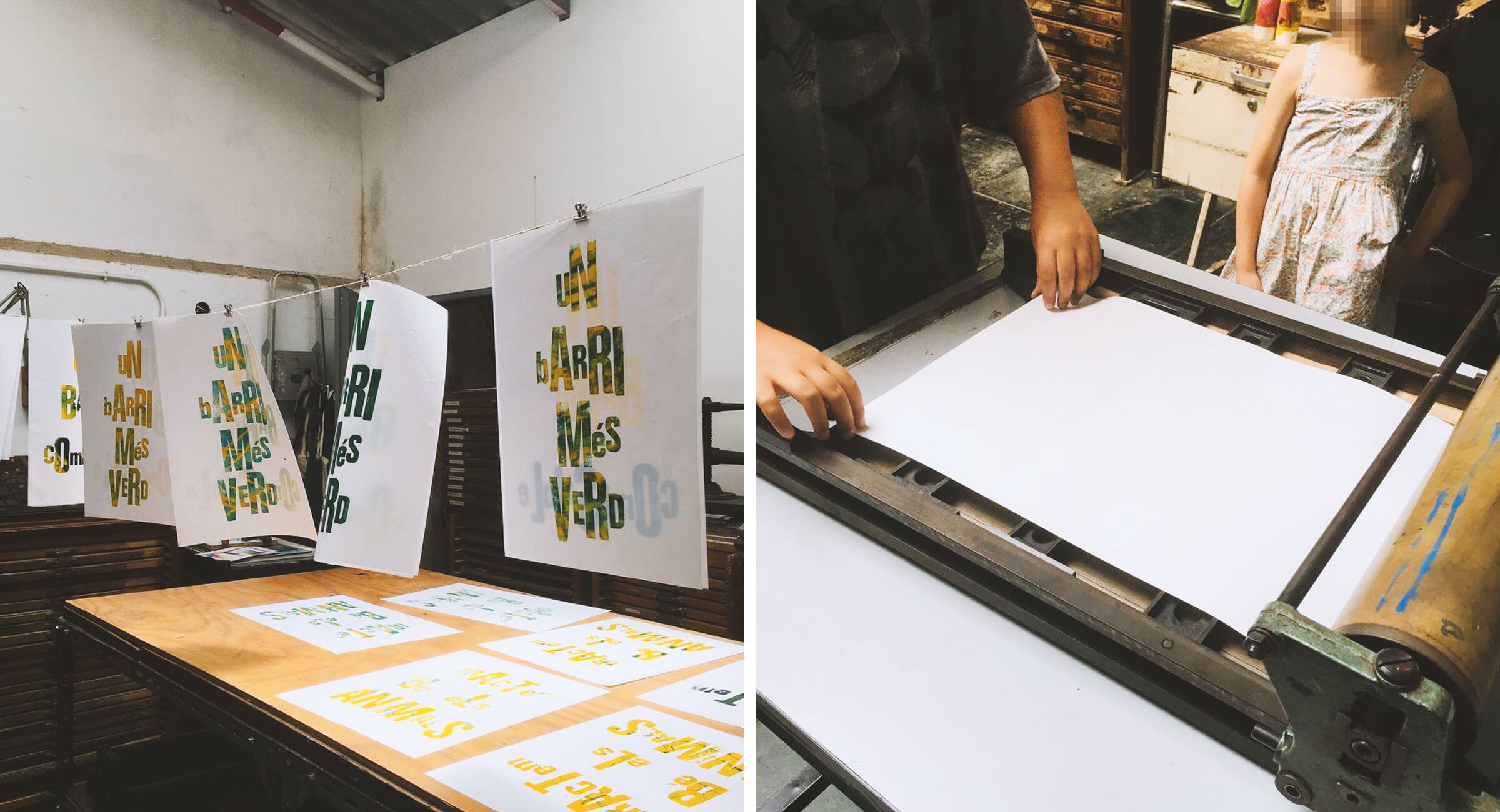 Taller amb tòrcul per al casal d’estiu d’EART on prèviament havien estat treballant els continguts, relacionats amb el canvi climàtic i la millora de l’entorn de proximitat del barri. Les frases seleccionades les van imprimir al tòrcul ells mateixos, permetent que cada nen i nena fes el procés d’entitat i d’impressió. Els cartells resultants es van penjar posteriorment arreu del barri i d’EART.